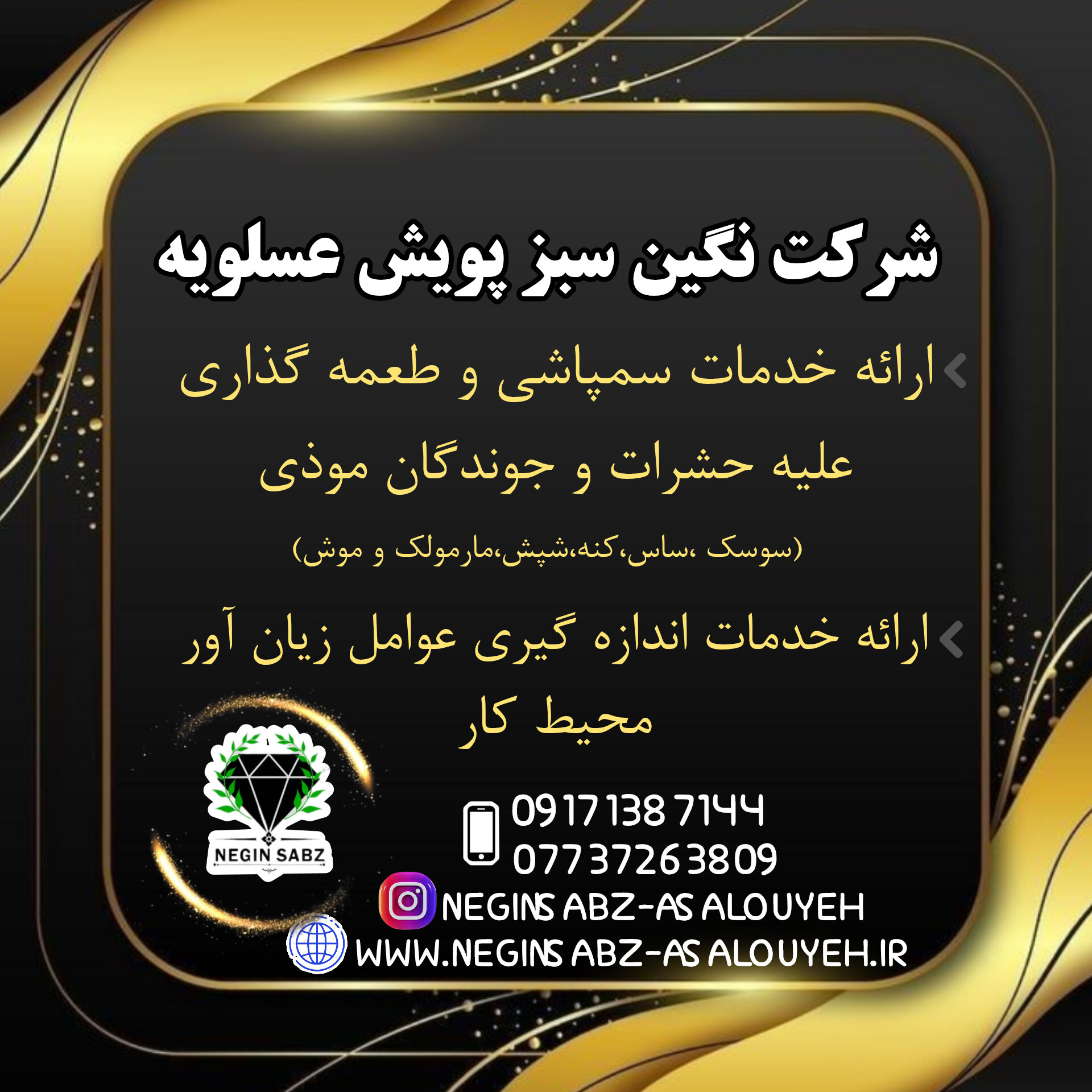 برای ریشه کنی حشرات مزاحم شرکت نگین سبز پویش عسلویه افتخار خدمت رسانی به سراسر استان بوشهر را دارد .
